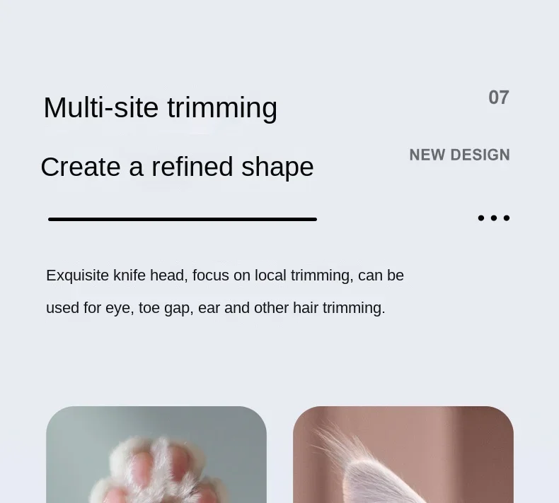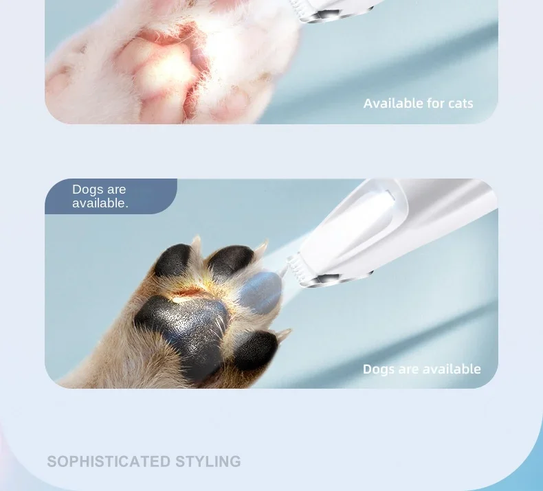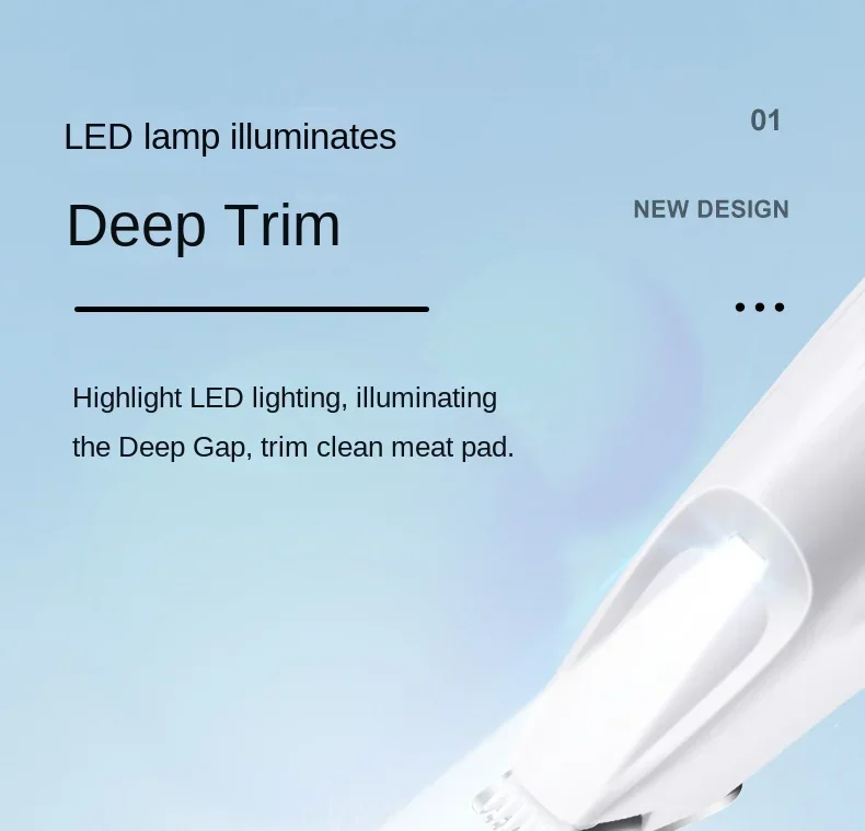 - Luz LED integrada → iluminação direta para aparar com precisão até nos vãos mais profundos das patinhas.