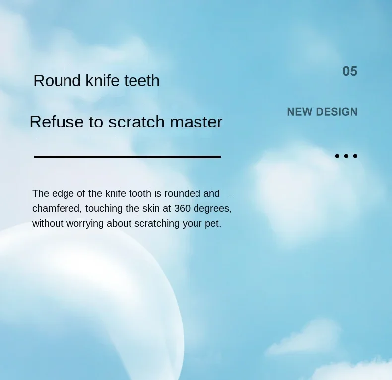 - Dentes de lâmina arredondados → tosa em 360° sem arranhar a pele do animal.
